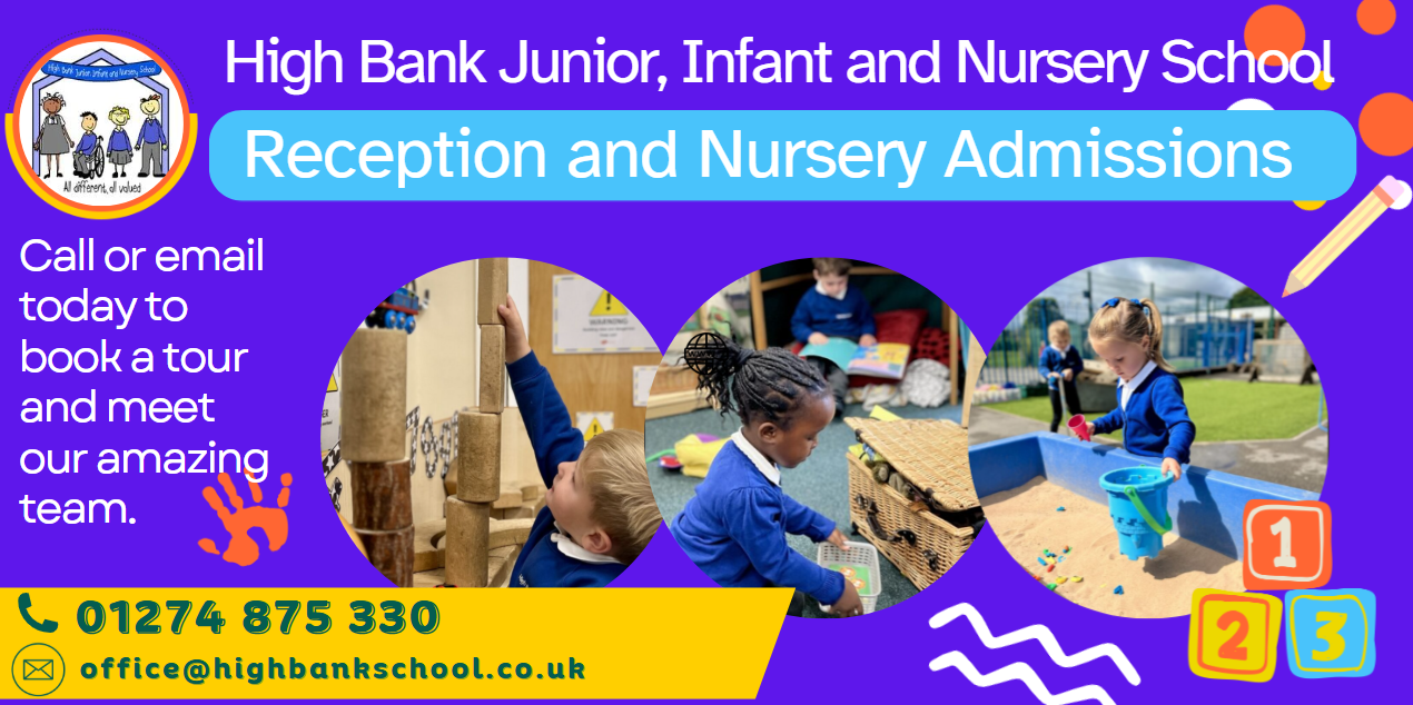 If you require any further information, or wish to organise a tour of our fantastic school and meet our amazing staff - please do not hesitate to contact us via email: office@highbankschool.co.uk or telephone 01274 875 330.